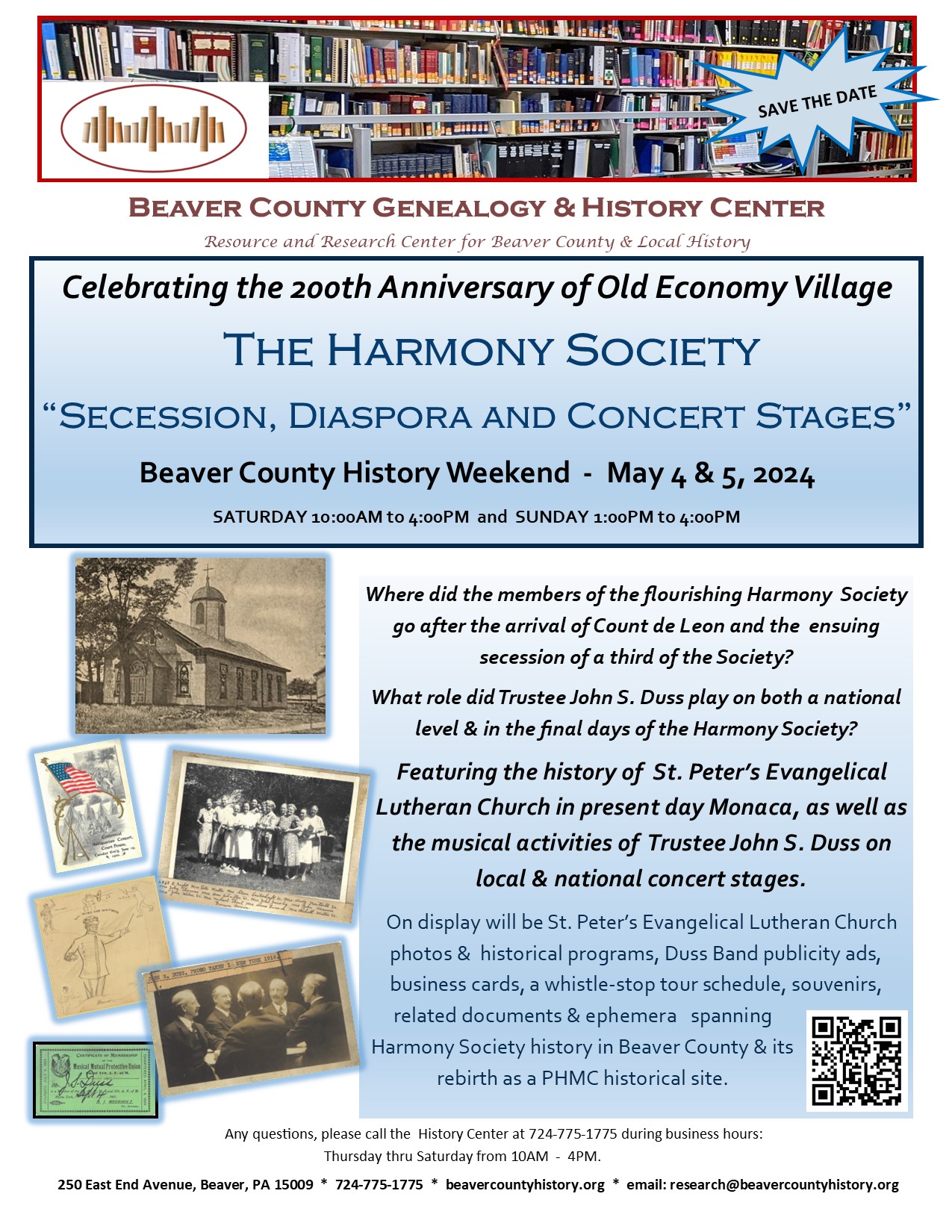 Beaver County History Weekend Exhibit - The Harmony Society "Secession, Diaspora and Concert Stages" May 4 & 5, 2024.